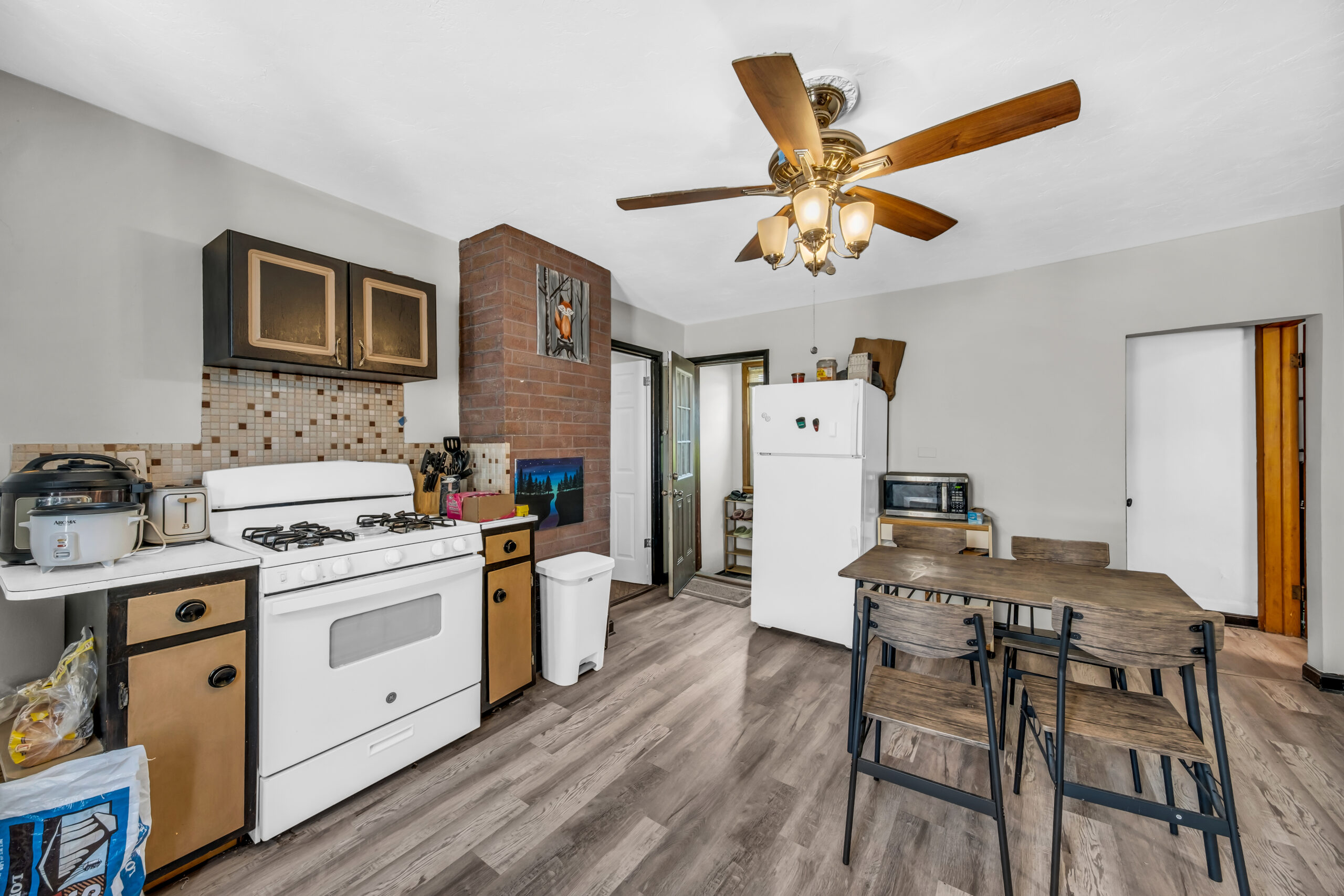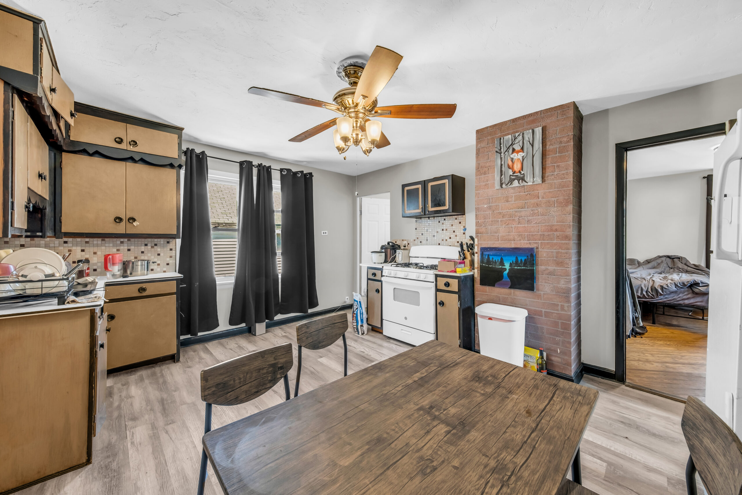 Fully furnished kitchen, dining room, and living room. Utensils, dishes, refrigerator, microwave, dishwasher, stove, oven, and tables/desks are all included.